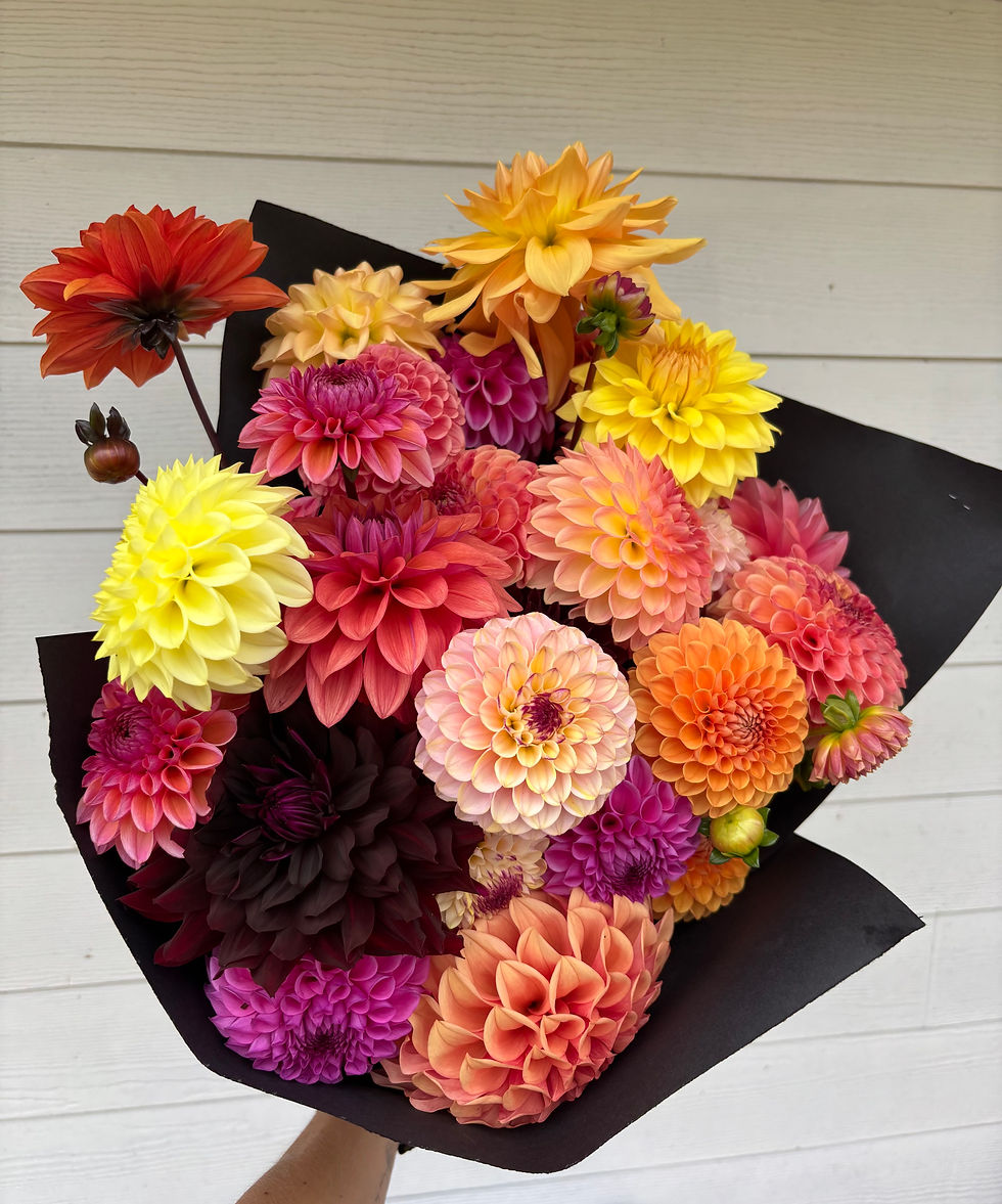 We take great pride in cultivating a diverse range of dahlias on our farm, with a particular fondness for the earthy, soft, muted, and moody tones. No primary colors here! Our signature black matte paper is the perfect backdrop for all our carefully arranged 'all dahlia' bouquets which are hand tied with black satin ribbon for a touch of class. Choose a gift tag to accompany your flowers at checkout as well as requesting a color palette if available. In an ideal world, providing us with 24 hours notice to harvest, condition and prepare your custom bouquet is perfect, contact us directly to fill last minute requests. You may choose to collect from the farm or have it delivered within Greater Victoria, excluding the Sooke municipality. Fresh flowers are available for locals only.